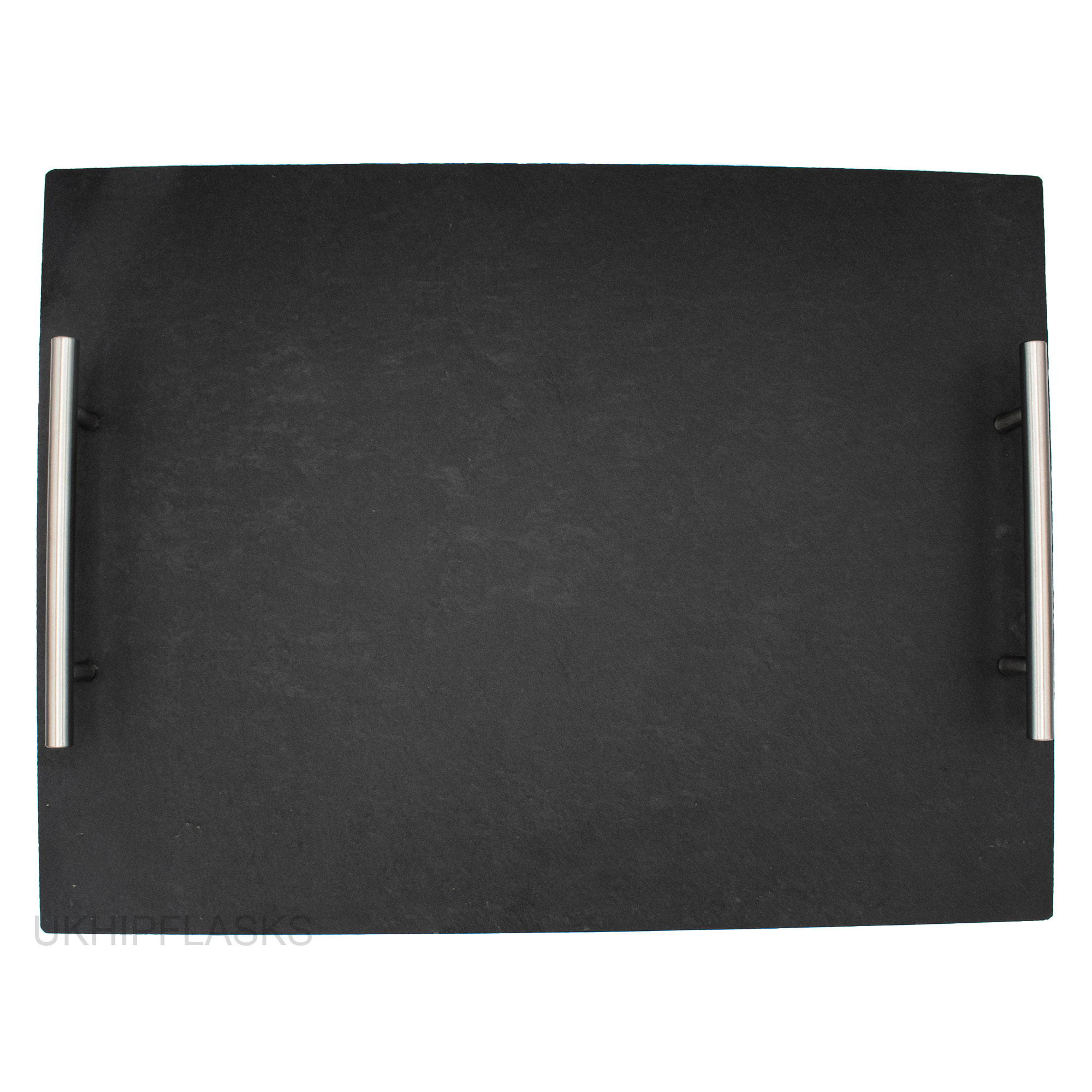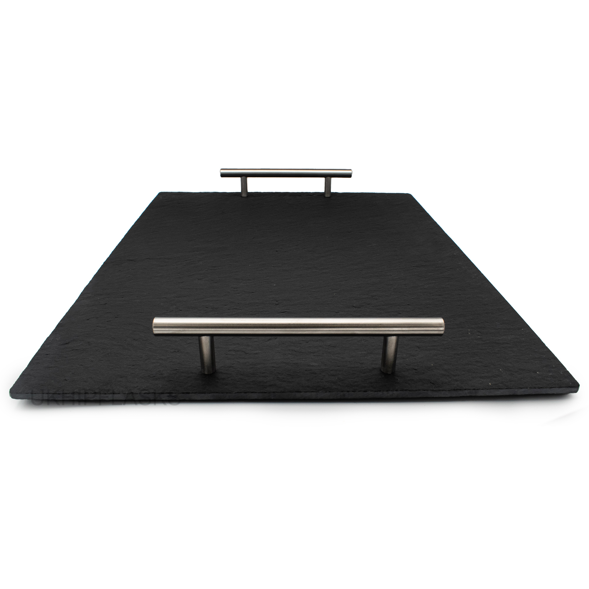 Eine moderne Servierplatte aus Schiefer mit praktischen Edelstahlgriffen – die perfekte und stilvolle Ergänzung für Ihr Zuhause.